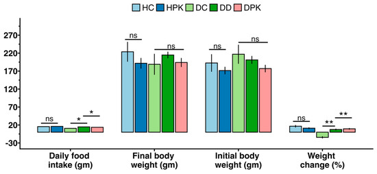 Body weight and food intake in both healthy and diabetic groups. Values are expressed as mean ± SD, (n = 8). HC (Healthy control); HPK (Healthy treated group); DC (Diabetic control); DPK (Diabetic treated group); DD (Diabetic drug group); * p < 0.05, ** p < 0.01 and ns = non-significant.