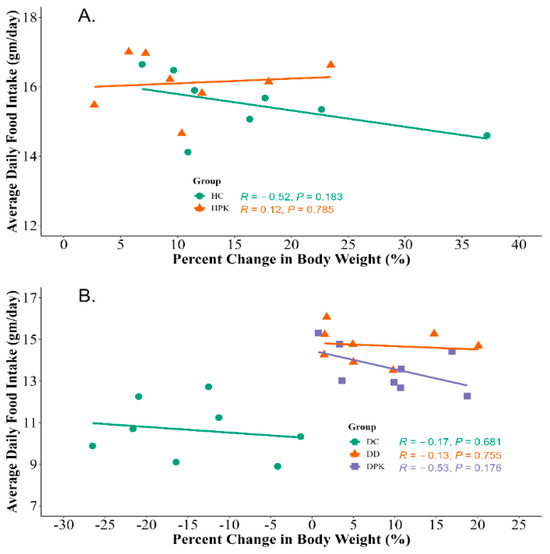 Correlation between average daily food intake and percent change in body weight. Subfigures label (A) indicates intervention in healthy group and label (B) indicates intervention in diabetic group; HC (Healthy control); HPK (Healthy treated group); DC (Diabetic control); DPK (Diabetic treated group); DD (Diabetic drug group).