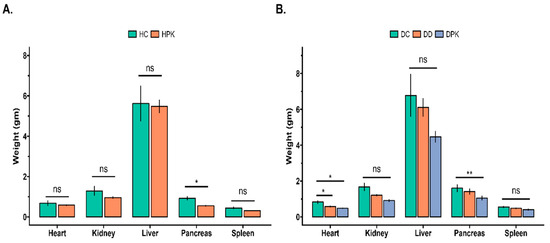 Organ weight and relative organ weight (organ/body weight) in both healthy and diabetic groups. Subfigures label (A,C) indicates intervention in healthy groups and Subfigures label (B,D) indicates intervention in diabetic groups. Here, HC (Healthy control); HPK (Healthy treated group); DC (Diabetic control); DPK (Diabetic treated group); DD (Diabetic drug group). Output from repeated measure of ANOVA and p value indicates significant difference between two groups at each time point. * p < 0.05, ** p < 0.01 and ns = non-significant.