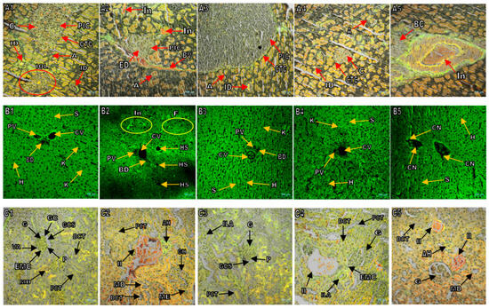 Microscopic images of hepatic tissues were also examined and compared among different groups of rats. The first group consisted of normal rats, while the second group had diabetic rats. The images showed that normal rats had well-arranged hepatic cells radiating from a normal hepatic central vein (Figure 7B1). However, diabetic rats had severe hydropic degeneration with cloudy and fatty cells, along with inflammatory cell infiltration (Figure 7B2). On the other hand, the third group of rats, which were non-diabetic and treated with PK, showed no significant pathological changes in the hepatic tissue (Figure 7B3). Finally, diabetic rats treated with PK and glibenclamide showed a significant improvement in the precipitated lesions and had no inflammatory infiltration (Figure 7B4,B5).