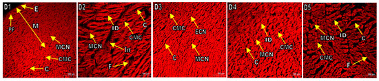 The healthy heart tissues in rats showed normal myocardium with regular myofibrils and muscle bundles, as seen in Figure 7D1. However, in diabetic rats, the structure of myofibrils was disorganized, and muscle bundles were detached due to necrosis (Figure 7D2). In the case of healthy treated rats, a slight inflammatory infiltration was detected (Figure 7D3). On the other hand, diabetic rats treated with PK extract showed mostly normal myocardial muscle bundles and myofibrils, as compared to the pathological improvement of lesions on the heart tissue of drug-treated rats (Group 5), as shown in Figure 7D4,D5.