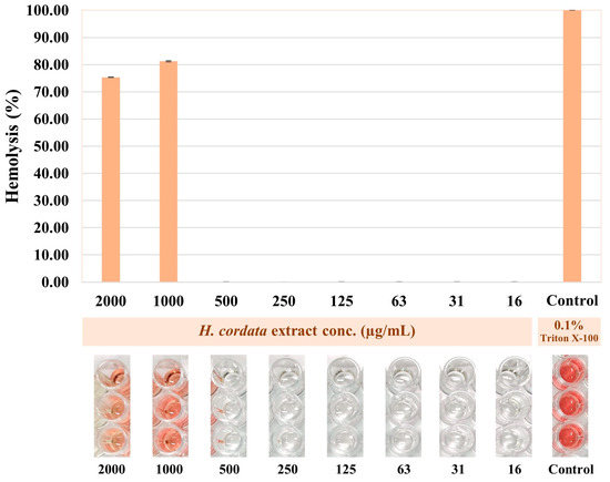 The hemolytic activity of PK was tested on normal human erythrocytes, and the extracts did not exhibit hemolytic activity at concentrations ranging from 16–500 µg/mL, but it showed a clearly distinctive effect at concentrations between 1000–2000 µg/mL, without a dose-dependent pattern, as seen in Figure 8. This study is the first to report on the hemolytic activity of plu kaow (H. cordata) ethanolic extract.