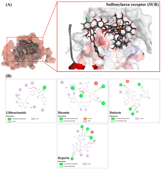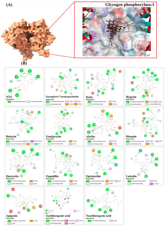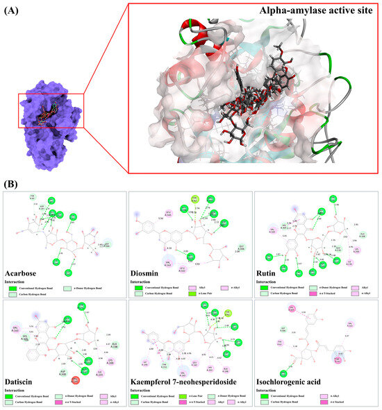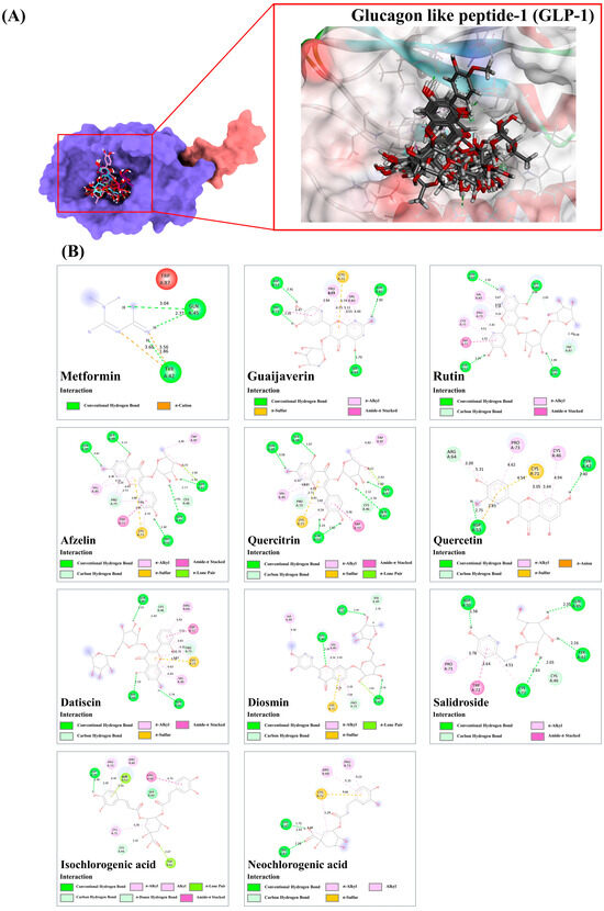 The seven target proteins chosen to explain plausible mechanisms underlying the in vivo antidiabetic activity of the PK were based on Van et al. [31], with some modifications. These proteins included alpha-amylase (PDB: 1SOE), alpha-glucosidase (PDB: 1UOK), the sulfonylurea receptor (SUR, PDB: 2E5Z), glycogen phosphorylase (GP, PDB: 1NOI), glucagon-like peptide−1 (GLP1, PDB: 3IOL), insulin-like growth factor 1 receptor kinase (IGF1R, PDB: 1K3A), and peroxisome proliferator-activated receptor gamma (PPAR-γ, PDB: 5YCP). CB-Dock2 (accessed on 10 April 2024 at https://cadd.labshare.cn/cb-dock2/php/blinddock.php#job_list_load) is used to generate complex structures of α-glucosidase/acarbose, SUR/luteolin, GLP-1/metformin, GP/NTZ, IGF1R/glibenclamide, and PPAR-γ/rosiglitazone as templates for analysis with GOLD 5.2.2 (Genetic Optimization of Ligand Docking). After self-docking was performed, all seven receptor-ligand complex structures exhibited RMSD values less than 2.0 Å, indicating their suitability for docking purposes. “The docking parameters, such as binding sites and scoring functions (e.g., CHEMPLP, GoldScore, ChemScore, and ASP), were optimized depending on the specific types of target proteins. The fitness score, as determined by the GOLD software, is defined as the negative sum of the component energies, in which a larger (less negative) fitness score indicates a better binding energy.