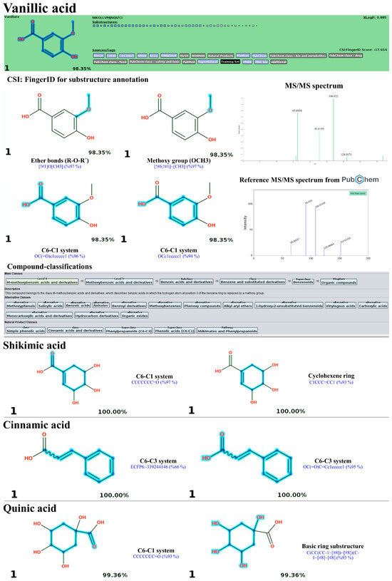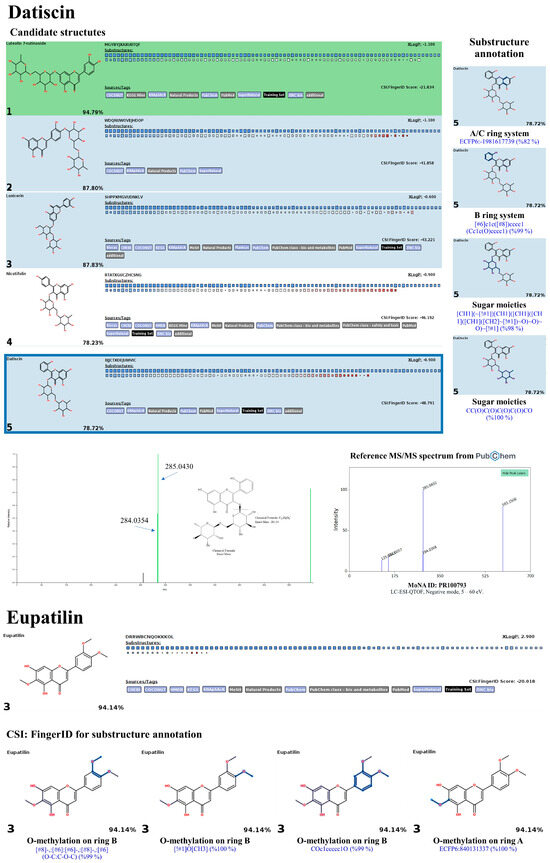 The raw MS/MS spectra of chosen metabolites from the PK were primarily analyzed using MetFrag software (accessed on 10 April 2024 at https://msbi.ipb-halle.de/MetFrag/) to acquire more details regarding the neutral formula, mass, and possible structure of the query metabolites. This process can be achieved through two steps of data processing: retrieving candidates and performing fragmentation setting and processing. Firstly, a specific formula along with the corresponding m/z value needs to be provided, where various types of suspected databases (e.g., KEGG, NORMAN, and PubChem) can be chosen to improve the accuracy of annotation. After receiving potential candidates, the experimental MS/MS data was used to match against the in-silico generated spectra of the retrieved candidates. Those achieving an F score closer to or equal to 1.0 should be considered potential candidates for the query subject.
