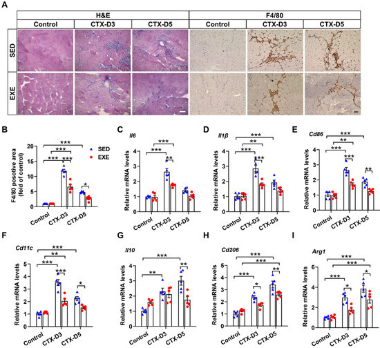 It is well known that macrophages can be divided into M1 proinflammatory macrophages and M2 anti-inflammatory macrophages. The balance of M1/M2 macrophages has profound effects on skeletal muscle regeneration in the later stage [30]. To further determine the effects of aerobic exercise on the skeletal muscle inflammatory response and macrophage recruitment, the expression of specific markers of M1 and M2 macrophages was measured. On Day 3, CTX injection caused more significant increases in the mRNA levels of M1 macrophage-specific markers (interleukin-6 (Il6), Il1β, Cd86, and Cd11c) in the SED group than in the EXE group. CTX injection also increased the mRNA levels of M2 macrophage-specific markers (Il10, Cd206, and Arg1) in the SED group but not in the EXE group, and the mRNA levels of Cd206 and Arg1 were lower in the EXE group than in the SED group. On Day 5, CTX injection had no obvious effect on the mRNA levels of M1 macrophage-specific markers in the EXE group but increased the mRNA levels of Cd86 and Cd11c in the SED group. CTX injection also caused greater increases in the mRNA levels of Il10, Cd206, and Arg1 in the SED group than in the EXE group (Figure 2C–F). Together, these results suggest that aerobic exercise may improve skeletal muscle injury by attenuating the inflammatory response and the recruitment of proinflammatory and anti-inflammatory macrophages.