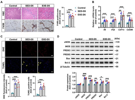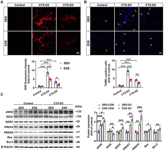 Previous reports have shown that oxidative stress, especially excessive superoxide production, can delay skeletal muscle regeneration [31] and that the number of apoptotic cells in the muscle is strongly associated with the severity of skeletal muscle injury [32]. To determine the effects of aerobic exercise on CTX-induced oxidative stress and apoptosis, frozen GA muscle sections were stained with DHE and TUNEL kits, respectively. On Day 3, CTX injection caused fewer increases in superoxide levels and apoptotic cell numbers in the GA muscle of the EXE group than in the SED group. On Day 5, the CTX-induced increases in superoxide production and apoptotic cell numbers were found only in the GA muscle of the mice in the SED group. In addition, the superoxide levels and number of apoptotic cells in the GA muscle were lower in the EXE group than in the SED group (Figure 3A,B).