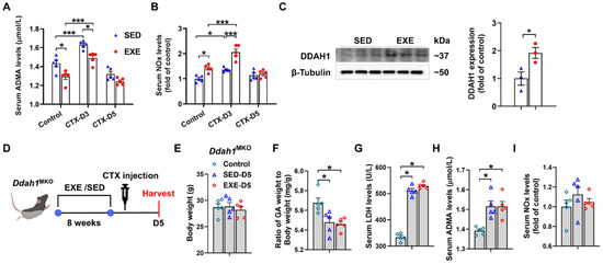 To determine whether DDAH1 is involved in the protective effect of aerobic exercise, we examined the serum levels of ADMA and nitrate/nitrite (NOx) in both the EXE and SED groups. Under control conditions, serum ADMA levels were decreased, whereas serum NOx levels were increased in the EXE group. On Day 3, CTX injection caused less increases in serum ADMA levels but more increases in serum NOx levels in the EXE group than in the SED group. However, there was no significant difference in the serum ADMA and NOx levels between the SED and EXE groups on Day 5 (Figure 4A,B). Western blot analysis revealed that swimming training for 8 weeks significantly increased DDAH1 expression in the GA muscle (Figure 4C). The age-matched Ddah1MKO mice were then randomly divided into three groups: the control, SED, and EXE groups. The mice in the EXE group were subjected to swimming training for 8 weeks and injected with CTX (Figure 4D). CTX injection did not affect the body weight and caused similar decreases in the GA weight-to-body weight ratio and increases in the serum LDH and ADMA levels in the SED and EXE groups (Figure 4E–H). The serum NOx levels were unaffected by CTX injection on Day 5, and there was no difference between the SED and EXE groups (Figure 4I).