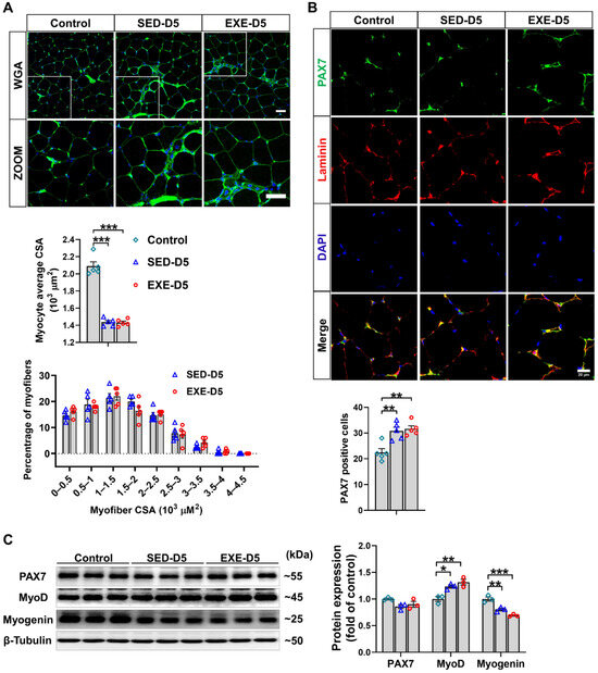 The beneficial effect of aerobic exercise on skeletal muscle-related diseases has long been acknowledged. For example, aerobic exercise can effectively reverse the decline in endurance capacity and alleviate skeletal muscle atrophy in aged mice [44]. Exercise can also protect against doxorubicin-induced skeletal muscle atrophy [45]. Growing evidence also suggests that aerobic exercise enhances skeletal muscle regeneration by affecting the activation, proliferation, differentiation, and fusion of satellite cells [46]. In the present study, we also showed that the mice in the aerobic exercise group had greater skeletal muscle regeneration efficiency after CTX-induced injury, as evidenced by the increased average CSA of muscle fibers and the greater proportion of medium-sized muscle fibers (1~1.5 × 103 μm2) in the GA muscle of the EXE group. PAX7 and MyoD are expressed in activated satellite cells [47], whereas myogenin and MEF2A are expressed in differentiated satellite cells [48] and help skeletal muscle myoblasts fuse [49]. Here, we demonstrated that GA muscle from the EXE group had more PAX7-positive cells and higher expression of PAX7, MyoD, myogenin, and MEF2A on Day 5 after CTX injection, suggesting that aerobic exercise caused significant increases in the numbers of activated and differentiated satellite cells, which are required for skeletal muscle regeneration. A similar effect of aerobic exercise on satellite cells has also been observed in aged mice [50].