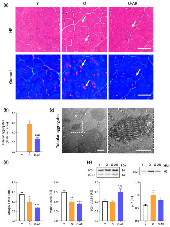 AdipoRon reduces age-related accumulation of tubular aggregates (TAgs). (a) TAgs (indicated by arrows) appear as pale or slightly basophilic inclusions with hematoxylin–eosin (HE) and bright pink ones with Gomori Trichrome on serial transversal cross-sections of TA from the three groups of mice (Y, O, and O-AR). Scale bars = 100 µm. (b) Quantification of TAg abundance after Gomori Trichrome was expressed as a % of stained area (i.e., bright pink inclusions areas normalized to the cross-sectional area of the muscle). (c) Characteristic honeycomb appearance of TAgs by transmission electron microscopy. Scale bar = 2 µm, Inset: higher magnification of a honeycomb TAg (scale bar = 1 µm). (d) Protein levels of Atrogin-1 and MURF1 were measured by ELISA. (e) LC3-II/LC3-I ratio and p62 were analyzed by Western blotting. p62 levels were normalized to Ponceau S staining (shown in Figure S4c,d). Results are presented as relative expression compared to O values (d,e). Data are means ± SEM for 6 Y, 6 O, and 9 O-AR. Statistical analysis was performed using unpaired two-tailed t-test to compare O and O-AR (b) or one-way ANOVA followed by Tukey’s test to compare the 3 groups of mice (d,e). * p < 0.05, ** p < 0.01, *** p < 0.001 vs. Y mice. # p < 0.05, ### p < 0.001 vs. O mice.