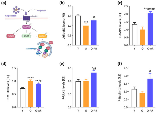 AdipoRon activates the AMPK pathway and promotes autophagy. (a) Proposed model for the effects of AdipoRon. Briefly, AdipoRon binds to AdipoR1 and activates the AMPK. AMPK plays a pivotal role in initiating autophagy by activating ULK1 and Beclin1, two critical regulators of the autophagic process. AMPK also exerts its regulatory influence by inhibiting mTOR, thereby alleviating mTOR-mediated inhibition of ULK1. LC3-II and p62 are two important proteins in the autophagy process. Pointed arrows indicate activation, while blunt arrows indicate inhibition. (b) AdipoR1 protein levels were measured by ELISA. Phosphorylated and active forms of (c) AMPKα (P-AMPK), (d) mTOR (P-mTOR), (e) ULK1 (P-ULK1), and (f) Beclin-1 (P-Beclin-1) were quantified by ELISA. Absorbance data were presented as relative expression compared with O values. Data are means ± SEM for 6 Y, 6 O, and 9 O-AR. Statistical analysis was performed using one-way ANOVA followed by Tukey’s test to compare the 3 groups of mice. * p < 0.05, ** p < 0.01, *** p < 0.001, **** p < 0.0001 vs. Y mice. # p < 0.05, #### p < 0.0001 vs. O mice.