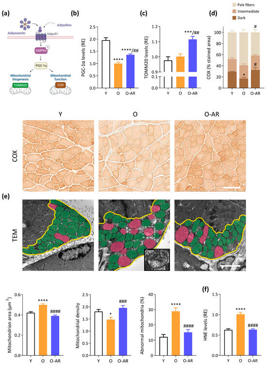 AdipoRon enhances mitochondrial biogenesis and function. (a) Activation of the AMPK-PGC-1α signaling pathway by ApN stimulate mitochondrial biogenesis and function. TOMM20 is a marker of mitochondrial content, while COX activity reflects mitochondrial activity. Pointed arrows indicate activation or induction. (b) PGC-1α and (c) TOMM20 protein levels quantified by ELISA. (d) Quantification of COX activity in the TA from the three groups of mice (Y, O and O-AR) based on histochemistry staining, for which representative transversal cross-sectional images are shown after. Three staining intensities were defined as pale, intermediate, or dark, with the darkest color being associated with the highest activity. Activity was expressed as % of stained area (i.e., colored areas normalized to the cross-sectional area of the muscle). Scale bar = 100 µm. (e) Transmission electron micrographs (TEM) of mitochondria in the subsarcolemmal region of G (transversal cross-sections) in the 3 groups of mice (Y, O, and O-AR). The yellow line delimits the subsarcolemmal area. Abnormal mitochondria are false-colored in pink, while normal mitochondria are colored in green. Representative images of each group are shown. Scale bar = 2 µm. The mitochondrion area and the number of mitochondria per µm2 in the subsarcolemmal region were calculated based on TEM images. The percentage of abnormal mitochondria out of the total number of mitochondria was also calculated. In total, 1117, 1604, and 1435 subsarcolemmal mitochondria were sampled for Y, O, and O-AR group, respectively. (f) HNE protein levels were quantified by ELISA. (b,c,f) Absorbance data were presented as relative expression compared with O values. Data are means ± SEM for 6 Y, 6 O, and 9 O-AR (b–d,f). Statistical analysis was performed using one-way ANOVA followed by Tukey’s test to compare the 3 groups of mice. * p < 0.05, *** p < 0.001, **** p < 0.0001 vs. Y mice. # p < 0.05, ## p < 0.01, ### p < 0.001, #### p < 0.0001 vs. O mice.