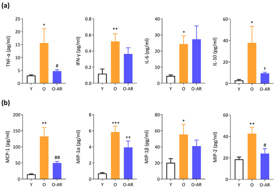 Senescence-Associated Secretory Phenotype (SASP) factors including circulating cytokines and chemokines increase in the bloodstream with aging [36]. Accordingly, in this study, plasma levels of several cytokines (Figure 6a) and chemokines (Figure 6b) rose by 2- to 13-fold in O mice compared to Y ones. Except for IL-6, all factors tended to decrease or were significantly reduced by AdipoRon treatment. Some, like tumor necrosis factor α (TNF-α), interleukin-10 (IL-10), monocyte chemoattractant protein-1 (MCP-1), and macrophage inflammatory protein-2 (MIP-2), were even close to Y values (Figure 6a,b).