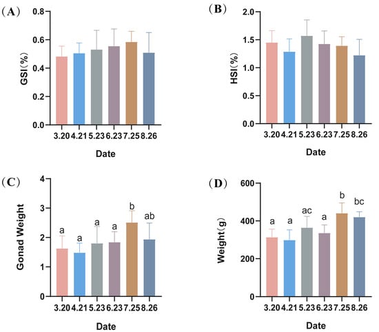 There were no significant differences (p > 0.05) in the gonadal index (GSI) or liver index (HSI) of male LMB (Figure 1). However, there were significant increases in gonad weight and body weight of LMB in July.