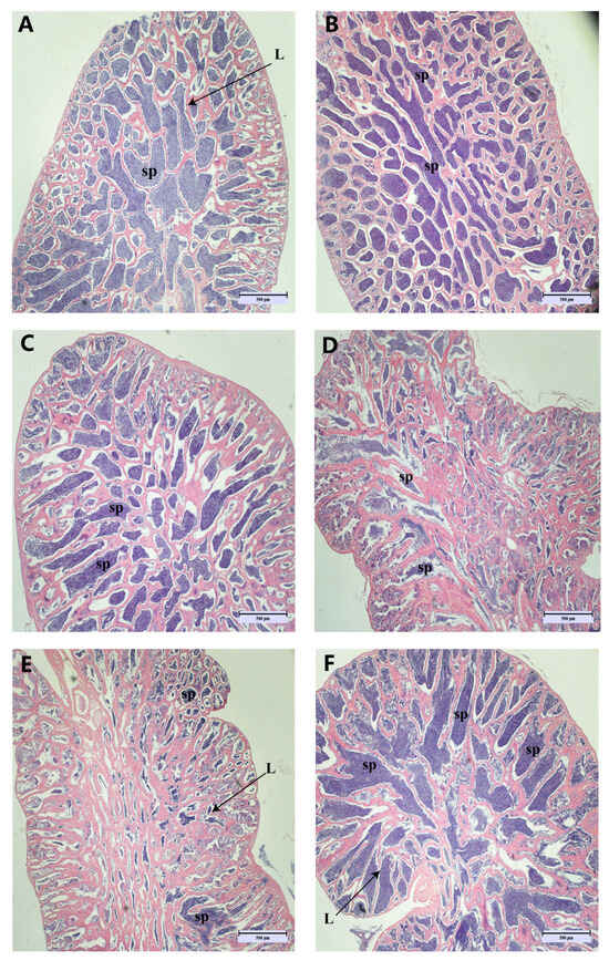 Histopathological appearance of spermatogonial tissue. (Magnification ×40, scale bar: 500 μm). Images (A–F) correspond to the histological section maps of March, April, May, June, July, and August. sp: spermatozoa; L: lobular lumen.