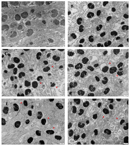 The ultrastructure of the spermatozoa was normal in March (Figure 3A); separation of the plasma membrane gradually began to appear in the head of the spermatozoa in April (red arrow in the figure), and the separation of the plasma membrane of the spermatozoa gradually increased with time (Figure 3B–F). The ultrastructure of the sperm tail was normal from March to August, and the “9 + 2” structure was maintained.