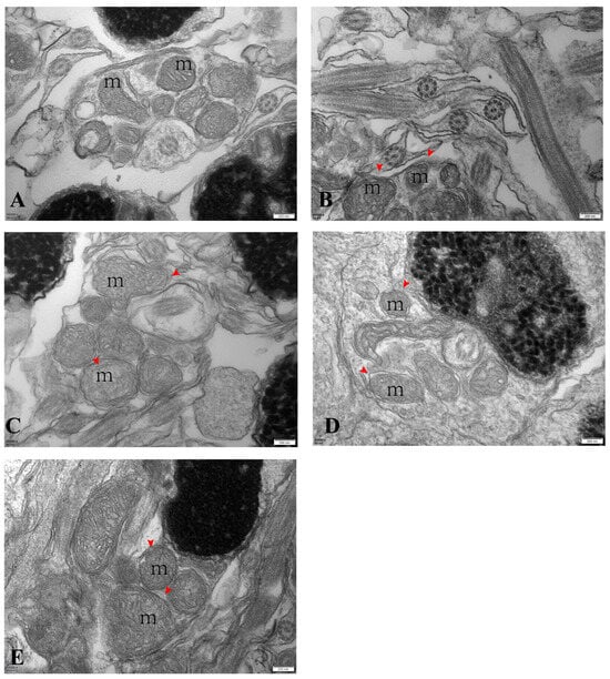 Electron micrographs of largemouth bass’s spermary (scale bar: 200 nm). Note: images (A–E) correspond to samples from April, May, June, July, and August. m: mitochondria; red arrow: swollen mitochondria in the center.