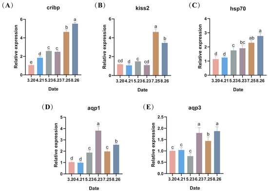 With the onset of low-temperature stress in LMB during out-of-season culture, the expression of the low-temperature marker gene cirbp in the testes gradually increased except in May and June, showing significant differences between months (p < 0.05), with its highest value in the final month (Figure 5A). Kisspeptin 2 (kiss2) was significantly expressed in July as well as in August (p < 0.05) (Figure 5B). Moreover, heat shock protein 70 (hsp70), a repair gene, showed an increasing trend, reaching its maximum in August (p < 0.05) (Figure 5C). Aquaporin 1 (aqp1) expression showed an increasing trend, followed by a decreasing trend, reaching its maximum level in June (Figure 5D). Aquaporin 3 (aqp3) expression was similar, also highly expressed in June, but its maximum level was reached in August (p < 0.05) (Figure 5E).