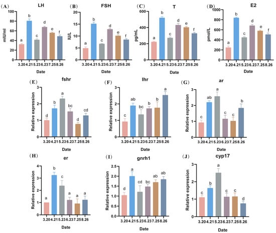 Effect of serum hormone levels, expression levels of hormone-related receptors and steroid hormone synthesis-related genes in largemouth bass (A–D): changes in hormone levels, (E–J) expression levels of hormone-related receptors in sperm and their steroid hormone synthesis-related genes) during counter-seasonal breeding. Note: Data are expressed as mean ± SD (n = 9). Different lowercase letters indicate significant differences at different sampling time points (p < 0.05).