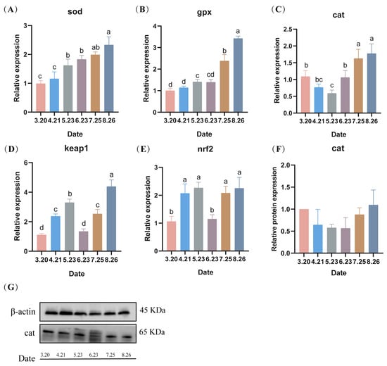 Under low-temperature stress, the expression of sod genes in LMB testes gradually increased with the prolongation of stress, reaching a maximum in August (Figure 7A). Similar to Superoxide dismutase (sod), Glutathione peroxidase (gpx) in LMB testes showed a gradual increase during fall reproduction, reaching a maximum in August (p < 0.05) (Figure 7B). Catalase (cat) genes of LMB sperm showed a trend of decreasing and then increasing under low temperature, reaching a minimum value in May (p < 0.05) and then increasing, reaching a maximum value in August (p < 0.05) (Figure 7C). Moreover, the expression of the antioxidant-related gene keap1 (kelch-like ECH-associated protein 1) of LMB showed an overall increasing trend with the prolongation of low-temperature stress (Figure 7D). In addition, the expression of the antioxidant-related gene nrf2 (Nuclear factor erythroid 2) also showed a significant increase with the prolongation of low-temperature stress (Figure 7E). The protein expression levels of the LMB testes cat during fall breeding were similar to the gene expression levels, both showing a decreasing trend, followed by an increasing trend (Figure 7F,G).