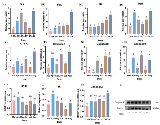 During the fall breeding of LMB, the mRNA expression levels of sperm nest pro-apoptotic factors, including B-cell lymphoma-2 (bcl2), BCL2-Associated X (bax), BCL-2 interacting death protein (bid), BCL2-associated death promoter (bad), Cytochrome-C (cyt-c), and caspase3, reached their highest values in August (p < 0.05). The expression levels of bax showed a trend of increasing and then decreasing from March to July (Figure 8A). The bcl2 expression levels were constant from April to July, and then reached a maximum in August (p < 0.05) (Figure 8B). The bid expression levels did not differ from March to May, but gradually increased from June to August and reached a maximum in August (p < 0.05) (Figure 8C). The expression level of caspase 3 was low from March to July, with no difference in April or May, and no difference in March, June, or July (p > 0.05) (Figure 8D). The protein expression level of caspase 3 was similar to the gene expression level, where there was no difference in expression from March to July, and then reached a maximum in August (p < 0.05) (Figure 8K,L). The expression levels of caspase8 and caspase9 were both highly expressed in August (Figure 8G,H). The expression levels of PI3K and AKT did not differ much from month to month and showed a decreasing trend (Figure 8I,J).