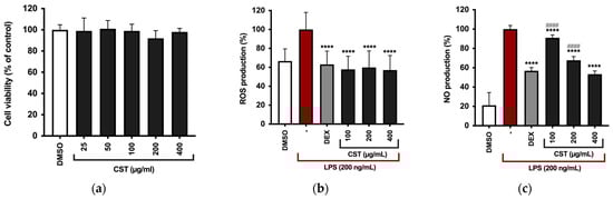 Subsequently, to evaluate the extract’s ability to mitigate the production of ROS, RAW 264.7 cells were pre-treated with CST at concentrations of 100, 200, and 400 µg/mL, and then stimulated with LPS (200 ng/mL) for 5 h. Dexamethasone (DEX) at 5 µg/mL was used as a positive control. ROS levels were quantified by DCFH2-DA and normalized to cell number with Crystal Violet staining. As shown in Figure 3b, all tested concentrations significantly reduced ROS production in LPS-stimulated RAW 264.7 cells.