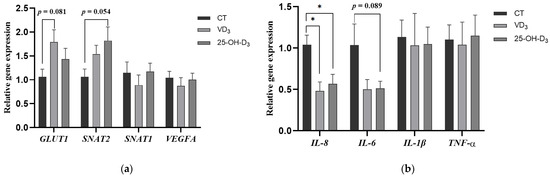In addition, the gene expression of pro-inflammatory factor IL-8 in the placenta of sows fed diets supplemented with VD3 and 25-OH-D3 was significantly decreased compared to the CT group (p < 0.05), and the gene expression of placental IL-6 in the 25-OH-D3 group tended to be reduced compared to the CT group (p = 0.089) (shown in Figure 2b).