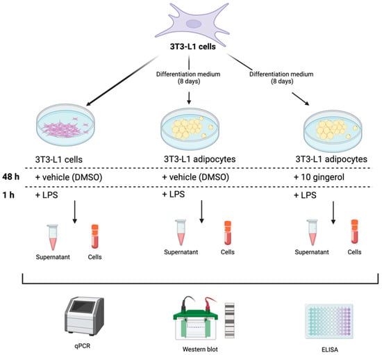 Three study groups were formed: the first group consisted of undifferentiated 3T3-L1 cells, and the second group consisted of 3T3-L1 cells differentiated into adipocytes over 8 days (Adipocytes group). Both groups were stimulated with 0.5% DMSO as a vehicle. The last group were 3T3-L1 cells differentiated into adipocytes (8 days of differentiation) treated for 48 h with a medium containing 15 µg/mL of 10-gingerol and 0.5% of DMSO (10-G group). The dosage was determined using a cytotoxicity curve (Table S1), and the experimental conditions were based on a previous study [21]. All groups were incubated with medium with LPS (100 ng/mL) for 1 h before being harvested to promote an inflammatory environment [30]. Supernatants from study groups were collected in 1.5 mL microtubes and stored at −80 °C until use. Finally, 3T3-L1 preadipocytes and adipocytes were cryopreserved at −80 °C for experimental analysis (Figure 1).