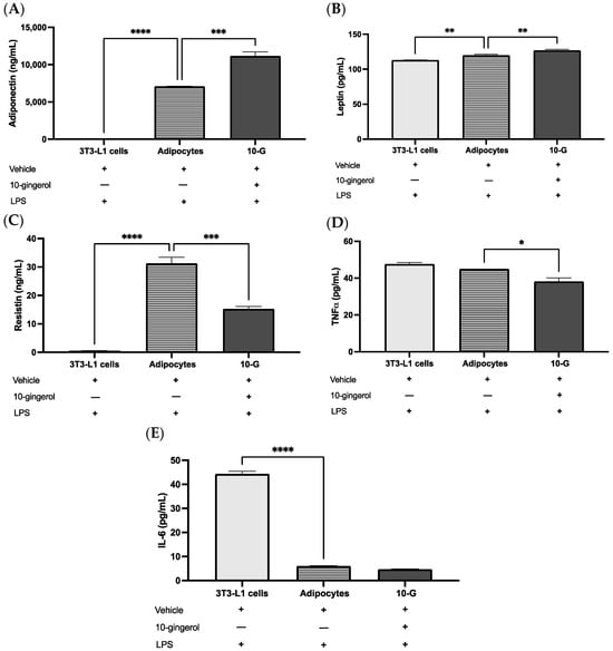 10-gingerol attenuates LPS-induced inflammation by modulating adipokines in 3T3-L1 adipocytes. 10-gingerol increases (A) adiponectin and (B) leptin concentrations, reduces (C) resistin and (D) TNFα concentrations, but does not affect (E) IL-6 levels in a state of LPS-induced inflammation in 3T3-L1 adipocytes. Values plotted represent mean ± SEM. The assays were performed in triplicate. Differences were analyzed using one-way ANOVA and Tukey’s post hoc. * p < 0.05, ** p < 0.01, *** p < 0.001, **** p < 0.0001. LPS, lipopolysaccharide.