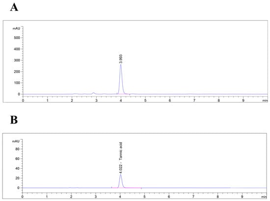 Figure 1. HPLC chromatogram of (A) Q. infectoria gall extract and (B) standard tannic acid. The clear peak at retention time ~4 min indicated the presence of tannic acid.