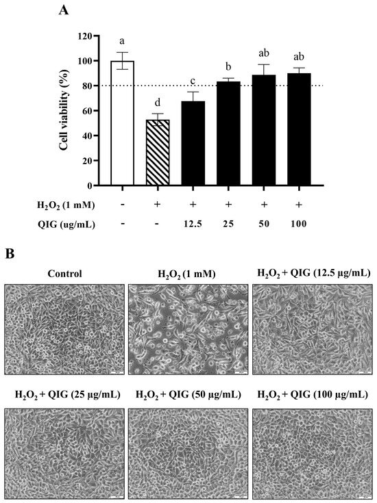 Figure 3. The protective effects of Quercus infectoria gall extract (QIG) against H2O2-induced injury in L929 fibroblasts. Cells were treated with 1 mM of H2O2 in the presence or absence of QIG ranging from 12.5 to 100 µg/mL for 24 h. (A) Cell viability was assessed using an MTT assay. The values are expressed as relative to the control group (untreated cells). Values are representative of three independent experiments performed in triplicate and are expressed as mean ± SD (error bars). Different letters indicate statistically significant differences (p < 0.05). (B) Representative microscopic images at a magnification of 200×. Scale bar = 50 µm.