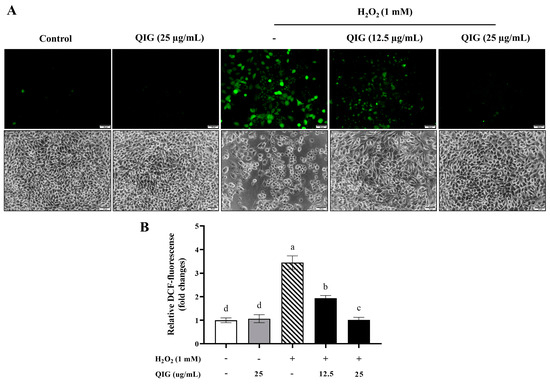 Figure 4. The effects of Quercus infectoria gall extract (QIG) on intracellular ROS generation upon H2O2-induced oxidative stress in L929 fibroblasts. Cells were treated with either 25 µg/mL QIG, 1 mM H2O2, or 1 mM H2O2 together with different doses of QIG (12.5 and 25 µg/mL) for 24 h. (A) Intracellular ROS levels were measured by 2′,7′-dichlorofluorescein diacetate (DCF-DA) staining. The intracellular ROS formation was observed under a fluorescent microscope at a magnification of 200×. Scale bar = 50 µm. (B) Relative fluorescence intensity results. The values are expressed in fold changes compared with the control group (untreated cells). Values are representative of three independent experiments performed in triplicate and are expressed as mean ± SD (error bars). Different letters indicate statistically significant differences (p < 0.05).