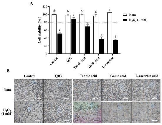 Figure 5. Comparative effects of Q. infectoria gall extract (QIG) and the main components presented in the nutgall on H2O2-induced injury in L929 fibroblasts. Cells were treated with 1 mM of H2O2 in the presence or absence of either QIG, tannic acid, gallic acid, or L-ascorbic acid at a concentration of 25 µg/mL for 24 h. (A) Cell viability was assessed using an MTT assay. The values are expressed as relative to the control group (untreated cells). Values are representative of three independent experiments performed in triplicate and are expressed as mean ± SD (error bars). Different letters indicate statistically significant differences (p < 0.05). (B) Representative microscopic images at a magnification of 200×. Scale bar = 50 µm.