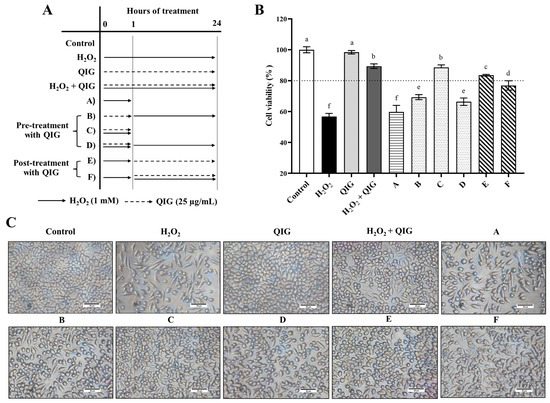 Figure 6. The protective effects of Quercus infectoria gall extract (QIG) against H2O2-induced injury in L929 fibroblasts at different time intervals. (A) Scheme showing the treatment of L929 fibroblasts. Cells were treated with 1 mM of H2O2 (solid line arrow) and/or 25 µg/mL of QIG (dashed arrow) at various time points. (B) Cell viability was assessed using an MTT assay. The values are expressed as relative to the control group (untreated cells). Values are representative of three independent experiments performed in triplicate and are expressed as mean ± SD (error bars). Different letters indicate statistically significant differences (p < 0.05). (C) Representative microscopic images at a magnification of 200×. Scale bar = 50 µm.