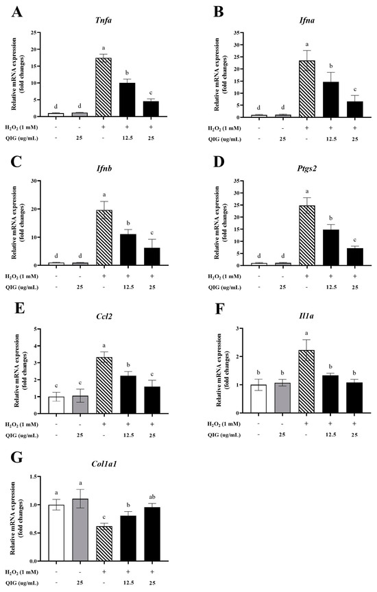 Figure 7. The effects of H2O2 and Quercus infectoria gall extract (QIG) on the expression of genes associated with inflammation and collagen synthesis in fibroblasts. Cells were treated with either 25 µg/mL QIG, 1 mM H2O2, or 1 mM H2O2 together with different doses of QIG (12.5 and 25 µg/mL) for 6 h. (AF) RT-qPCR results for the expression of inflammation-related genes: Tnfa, Ifna, Ifnb, Ccl2, Ptgs2, and Il1a. (G) RT-qPCR analysis of the gene encoding collagen type 1 alpha 1 (Col1a1). Gene expression was normalized with Actb. The data are expressed in fold changes compared with the control group (untreated cells). Values are representative of three independent experiments performed in triplicate and are expressed as mean ± SD (error bars). Different letters indicate statistically significant differences (p < 0.05).