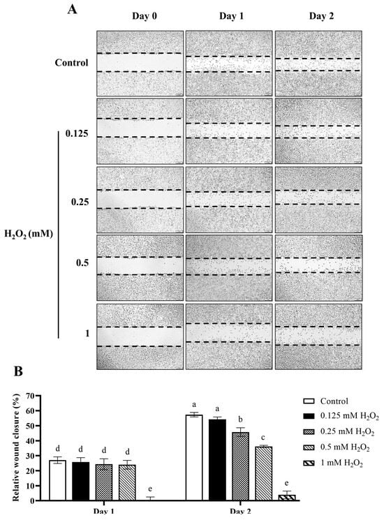 Figure 8. The effects of H2O2 on L929 fibroblasts wound healing. (A) A scratch assay of L929 cells treated with various concentrations of H2O2 (0.125 to 1 mM). The images represent cell migration at 0, 24, and 48 h of treatment. The area of the wound is defined by the dashed lines. (B) Quantification of wound closure rates (%), defined as the difference in wound area from day 0 of each group. Values are representative of three independent experiments performed in triplicate and are expressed as mean ± SD (error bars). Different letters indicate statistically significant differences (p < 0.05).