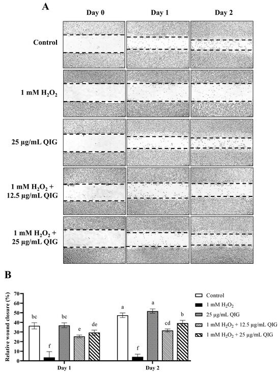 Figure 9. The wound healing effects of Quercus infectoria gall extract (QIG) on L929 fibroblasts under H2O2-induced oxidative stress. (A) A scratch assay of L929 cells treated with either 25 µg/mL QIG, 1 mM H2O2, or 1 mM H2O2 together with different doses of QIG (12.5 and 25 µg/mL). The images represent cell migration at 0, 24, and 48 h of treatment. The area of the wound is defined by the dashed lines. (B) Quantification of wound closure rates (%), defined as the difference in wound area from day 0 of each group. Values are representative of three independent experiments performed in triplicate and are expressed as mean ± SD (error bars). Different letters indicate statistically significant differences (p < 0.05).