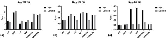 Figure 1 shows the Kmix values for the different extracts, from both raw and defatted CBSs, at 280, 320, and 420 nm. The SOX extraction methods show the highest value at 280 for both raw and defatted shells. These data indicate that the Soxhlet apparatus efficiently extracts substances from the matrix; unfortunately, 280 nm is the wavelength of absorption of the aromatic ring, and thus, most phenolic as well as protein residues absorb it. High values of Kmix were also obtained for the sample US/MW 90, both from raw and defatted CBSs, followed by US/MW 50 from defatted CBS. These data show that the unconventional extraction method of MW associated with US at 90 °C was particularly effective in extracting material from the matrix in both raw and defatted shells, but this cannot be associated directly with bioactive phenolic compounds, and more specific analyses are needed.