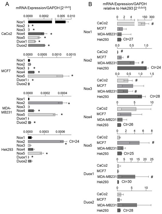 Nox family mRNA expression in cancer cell lines. mRNA expression of individual large membrane-bound subunits depicted as copy per copy of GAPDH (mean ct 15 ± 1) (A) and relative to mRNA expression in Hek293 cells (B). Mean ± SEM; n = 4; * p < 0.05 (gene of interest vs. Nox1); # p < 0.05 (mRNA expression in the cell of interest vs. Hek293).
