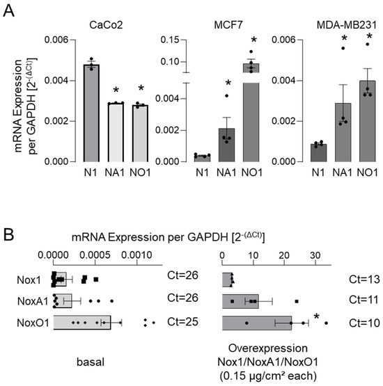 The following supporting information can be downloaded at https://www.mdpi.com/article/10.3390/antiox13091113/s1, Figure S1: NoxO1 mRNA expression per copy of GAPDH in murine tissue; Figure S2: mRNA expression level as nTPM as published within the human cancer atlas; Figure S3: Nox1, NoxA1 and NoxO1 mRNA expression in Hek293 cells overexpressing single components of the Nox1 centered NADPH oxidase.; Figure S4: ROS formation in CaCo2, MCF7 and MDA-MB231 overexpressing increasing plasmid amounts of GFP or Nox1/NoxA1/NoxO1.; Figure S5: ROS formation in Hek293 cells over expressing Nox1, NoxA1 and NoxO1 at accelerating concentration.; Figure S6: Nox1, NoxA1 and NoxO1 mRNA expression and ROS formation in Hek293 cells overexpressing single components of the Nox1 centered NADPH oxidase in constitutive NoxO1 overexpressing cells transfected with Nox1/NoxA1.