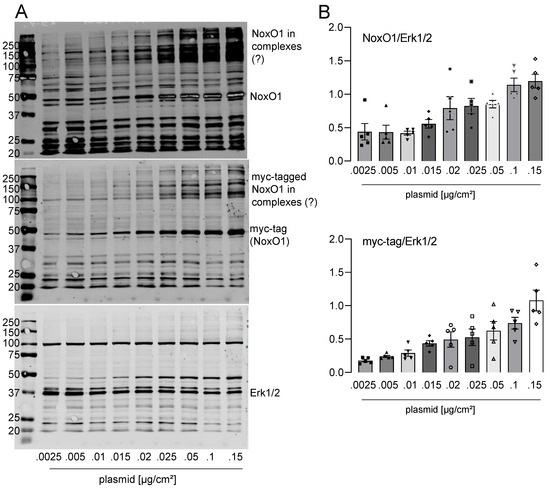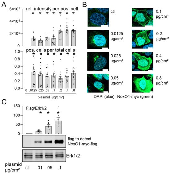 In immunofluorescence, it was observed that NoxO1 accumulated in the perinuclear endoplasmic reticulum when expressed at plasmid concentrations below 0.1 µg/cm2. However, when transfected with 0.1 or 0.2 µg plasmid/cm2, NoxO1 was predominantly observed at the plasma membrane. With increasing plasmid load, NoxO1 was found to be distributed throughout the entire cell (Figure 3B). It is noteworthy that the transfection efficacy, and consequently the number of cells expressing NoxO1, demonstrated a relatively consistent trend. In contrast to immunofluorescence, the Western blot analysis detecting the flag-tag of the overexpressed NoxO1 demonstrated robust expression of the NoxO1 protein even when cells were transfected with a minimal amount of plasmid DNA, at 0.01 µg/cm2. The expression of NoxO1 was observed to increase in conjunction with an escalation in plasmid concentration, reaching a peak at 0.1 µg/cm2. In light of the aforementioned experiments, it can be concluded that a concentration of 0.1 to 0.2 µg/cm2 of the NoxO1 plasmid is sufficient to achieve the optimal expression of the protein at the plasma membrane. Western blots for NoxO1 and myc-tag corroborated the findings obtained with the flag-tag antibody (Figure 4).
