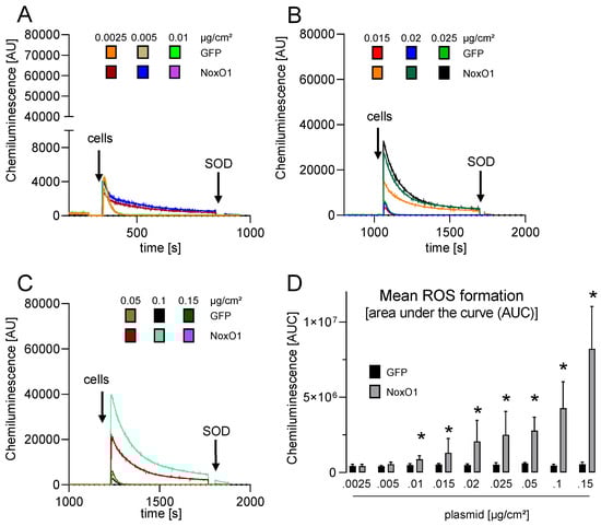 Upon overexpressing all components of the Nox1-centered NADPH oxidase with plasmid concentrations of 0.01 µg/cm2 each in Hek293 cells, no augmented L-012 signal was discerned in comparison to GFP-transfected cells. Furthermore, the superoxide formation did not exhibit a notable increase when the plasmid concentrations exceeded 0.05 µg/cm2 for each plasmid (Supplemental Figure S5).