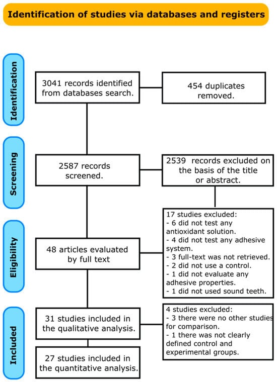 A total of 3041 papers were obtained from all databases. After removing duplicate entries, 2587 documents were reviewed by examining their titles and abstracts. Following this initial screening, 48 studies remained for a thorough examination of the full text. Among these, 17 were excluded for the following reasons: in 6, an antioxidant solution was not used [15,16,17,18,19,20]; in 4, an adhesive system was not tested [21,22,23,24] l3 studies lacked accessible full-text manuscripts [25,26,27]; in 2, a control group was not identified [28,29]; in 1, the bond strength was not tested [30]; and in 1, the bond strength was tested on caries-affected dentin [31]. A total of 31 articles were included in the qualitative analysis. However, four studies were excluded from the quantitative analysis. Three of these studies were removed because they lacked comparable data or similar study designs, making it impossible to perform a meaningful statistical comparison [32,33,34]. The fourth study was excluded because the control and experimental groups were not clearly defined, leading to potential inconsistencies in the data analysis [35]. Finally, 27 articles remained for the meta-analysis. Figure 1 illustrates the selection process according to the PRISMA statement.