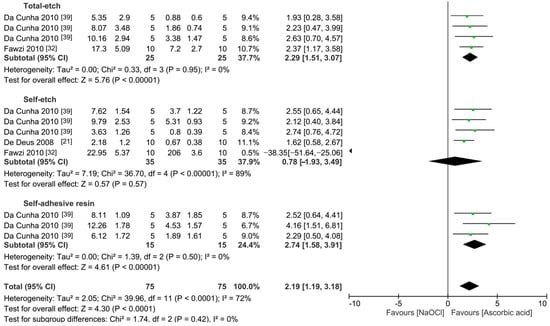 The meta-analyses were conducted according to the antioxidant evaluated. Separate meta-analyses for each antioxidant to evaluate their individual effects on bond strength to sodium hypochlorite-treated dentin were conducted. Additionally, subgroup analyses were conducted according to the type of adhesive used to assess how different adhesive systems influence the efficacy of the antioxidants. These analyses were aimed at identifying specific patterns and understanding how various factors impact the overall findings. Figure 2, Figure 3, Figure 4, Figure 5, Figure 6, Figure 7, Figure 8 and Figure 9 show these results.