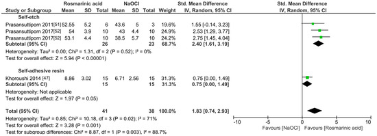 Forest plot showing the effect of the application of rosmarinic acid as pretreatment on the bond strength to sodium hypochlorite-treated dentin.