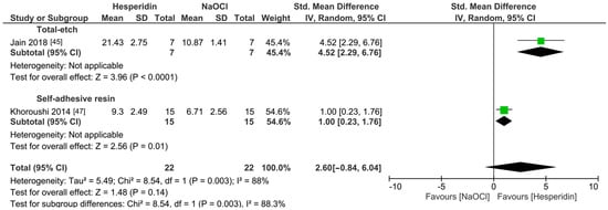 Forest plot showing the effect of the application of hesperidin as pretreatment on the bond strength to sodium hypochlorite-treated dentin.