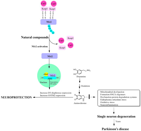 The disadvantage of single neuron degeneration is the difficulty of being used in an animal model. Unfortunately, it is impossible to use aminochrome as a preclinical model in an animal since the technology does not exist to inject a single neuron. Therefore, the only possibility to search for new molecules that may have a therapeutic effect in a single-neuron degeneration model is to search for molecules that (i) increase the expression of DT-diaphorase and Glutathione transferase M2-2 through activation of the KEAP1/Nrf2 signaling pathway; and (ii) these molecules prevent the neurotoxic effects of aminochrome in cell cultures.