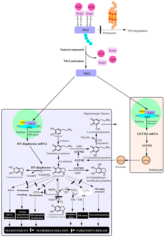 Natural compounds activate the KEAP1/Nrf2 signaling pathway, which increases the expression of antioxidant enzymes such as DT-diaphorase in dopaminergic neurons and glutathione transferase M2-2 (GSTM2) in astrocytes. In neuromelanin-containing dopaminergic neurons, Nfr2 increases the expression of DT-diaphorase, which prevents neurotoxic effects of aminochrome such as the formation of neurotoxic oligomers of alpha-synuclein, dysfunction of protein degradation systems, mitochondrial dysfunction, oxidative stress, endoplasmic reticulum stress and neuroinflammation. In astrocytes, Nfr2 increases the expression of GSTM2, which is excreted through exosomes that penetrate neuromelanin-containing dopaminergic neurons. Within this neuron, GSTM2 is released, conjugating aminochrome to 4-S-glutathionyl 5,6-dihydroxindoline, which is resistant to biological oxidants such as hydrogen peroxide, superoxide and dioxygen. In addition, GSTM2 conjugates dopamine o-quinone to 5-glutathionyldopamine, which is enzymatically degraded to 5-cysteinyldopamine, a metabolite that has been found in human neuromelanin and cerebrospinal fluid, suggesting that this metabolite is a final product. Cullin 3 E3 ubiquitin ligase (Cul3); Kelch-like ECH-associated protein 1 (KEAP1); ubiquitin (ub); E2-related factor 2 (Nfr2); small musculoaponeurotic fibrosarcoma (sMaf); antioxidant responsive element (ARE); endoplasmic reticulum (ER); reduced glutathione (GSH); glutamate (glu); glycine (gly); alpha-synuclein (SNCA); hydrogen peroxide (H2O2).