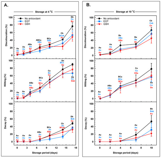 The incidence of discolouration, wilting, and decay in arugula immersed in a pre-storage dip containing either 100 μM ergothioneine (EGT), 500 μM glutathione (GSH), or no antioxidant, and then stored at 4 °C (A) or 10 °C (B). Each datum represents the mean incidence ± SE of three experimental replicates. Within each plot, uppercase letters denote statistical comparisons within a treatment across the storage period; lowercase letters denote statistical comparisons across the treatments at each postharvest sampling time. Shared letters represent no significant difference between means at p ≤ 0.05.