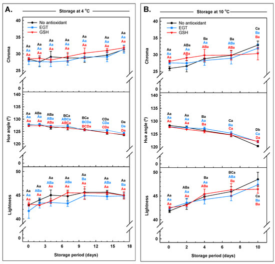 Leaf chroma, hue angle, and lightness in arugula that was immersed in a pre-storage dip containing either 100 μM ergothioneine (EGT), 500 μM glutathione (GSH), or no antioxidant, and then stored at 4 °C (A) or 10 °C (B). Each datum represents the mean ± SE of three experimental replicates. Within each plot, uppercase letters denote statistical comparisons within a treatment across the storage period; lowercase letters denote statistical comparisons across the treatments at each postharvest sampling time. Shared letters represent no significant difference between means at p ≤ 0.05.