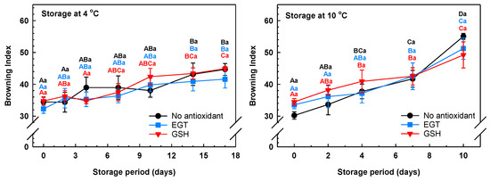 Browning index of arugula immersed in a pre-storage dip containing either 100 μM ergothioneine (EGT), 500 μM glutathione (GSH), or no antioxidant, and then stored at 4 °C or 10 °C. Each datum represents the mean ± SE of three experimental replicates. Within each plot, uppercase letters denote statistical comparisons within a treatment across the storage period; lowercase letters denote statistical comparisons across the treatments at each postharvest sampling time. Shared letters represent no significant difference between means at p ≤ 0.05.